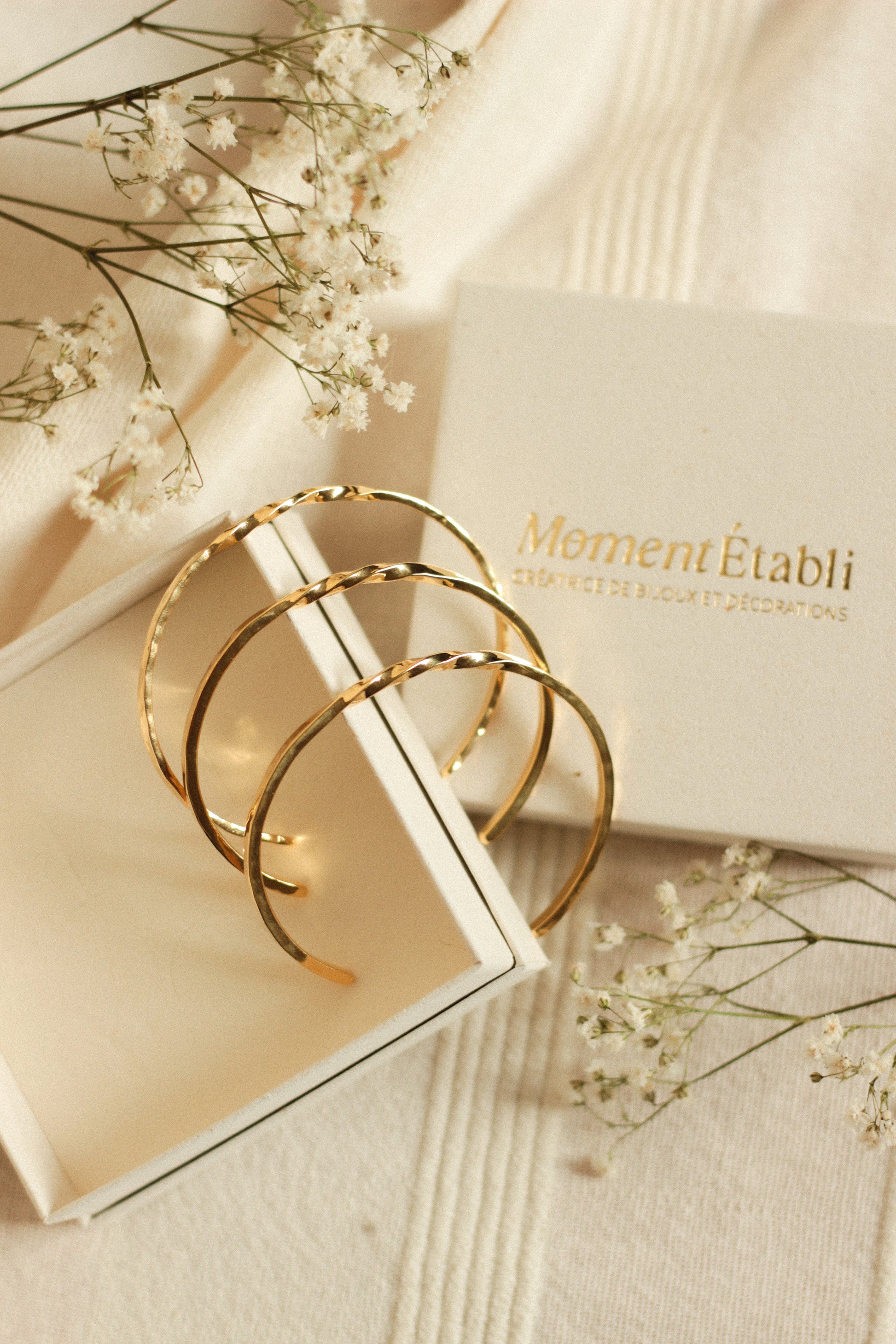 Le bracelet jonc Ondine est une jolie pièce finement martelée et torsadée à la main, à porter seule ou en accumulation.