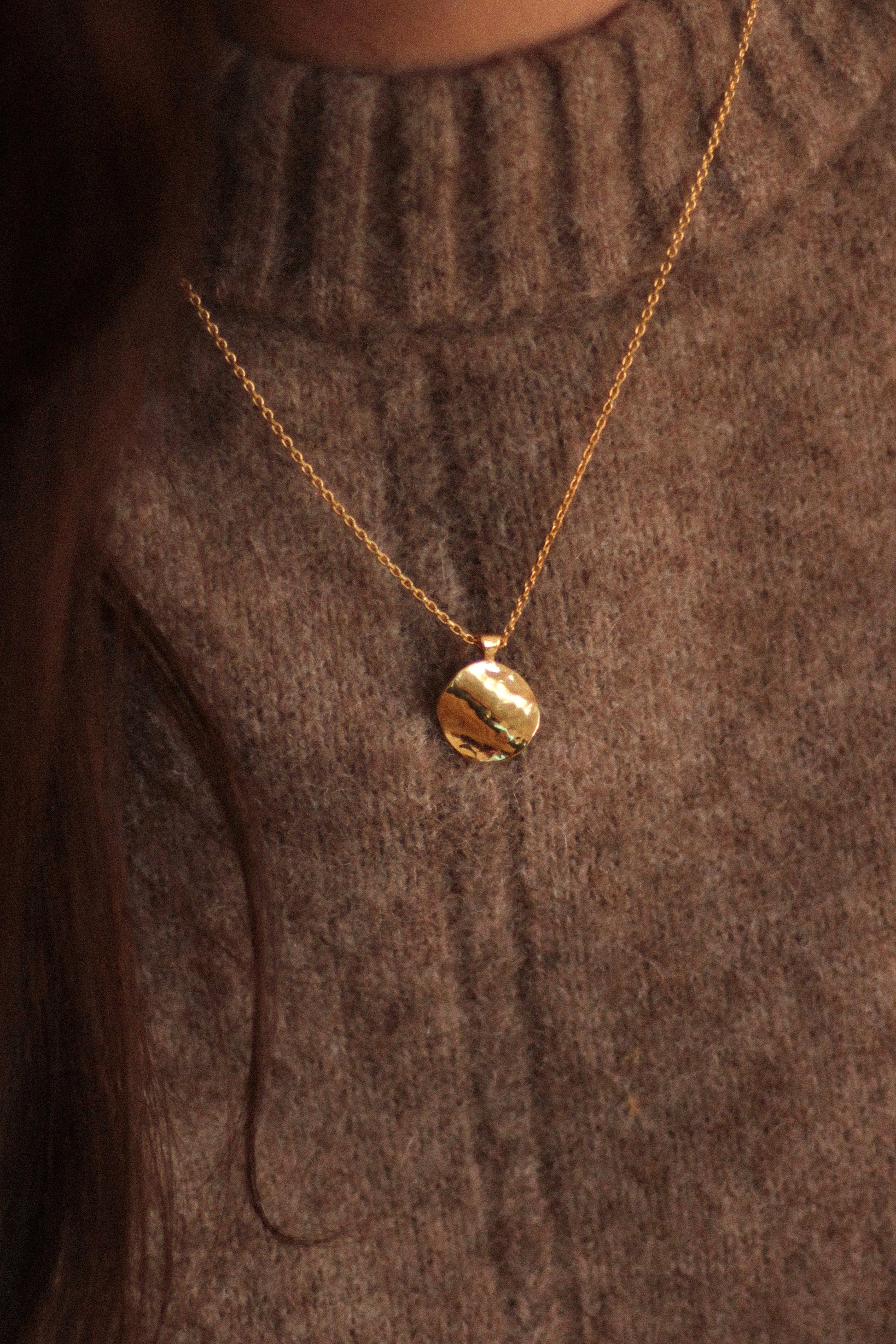 Le collier Ondine se compose d'un pendentif finement courbé et martelé à la main. Ses courbes et son martelage reflètent la lumière à chaque mouvement, c'est comme porter un éclat de soleil à même la peau.