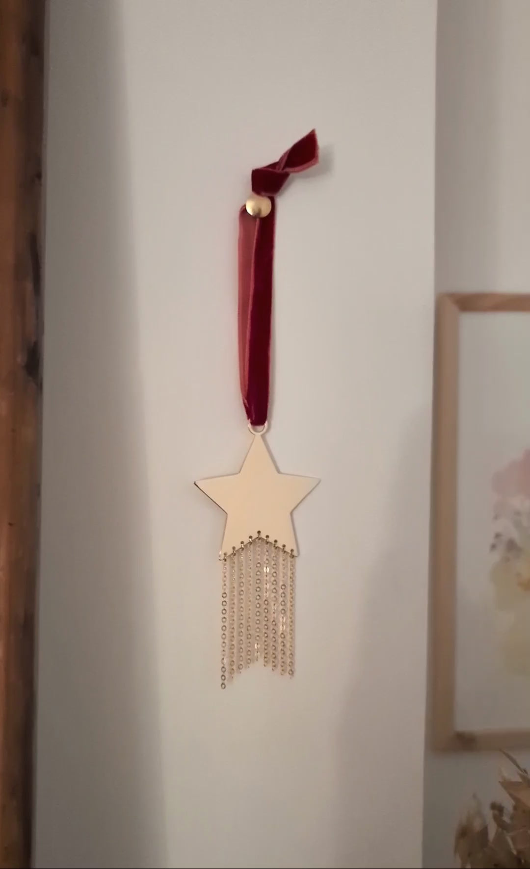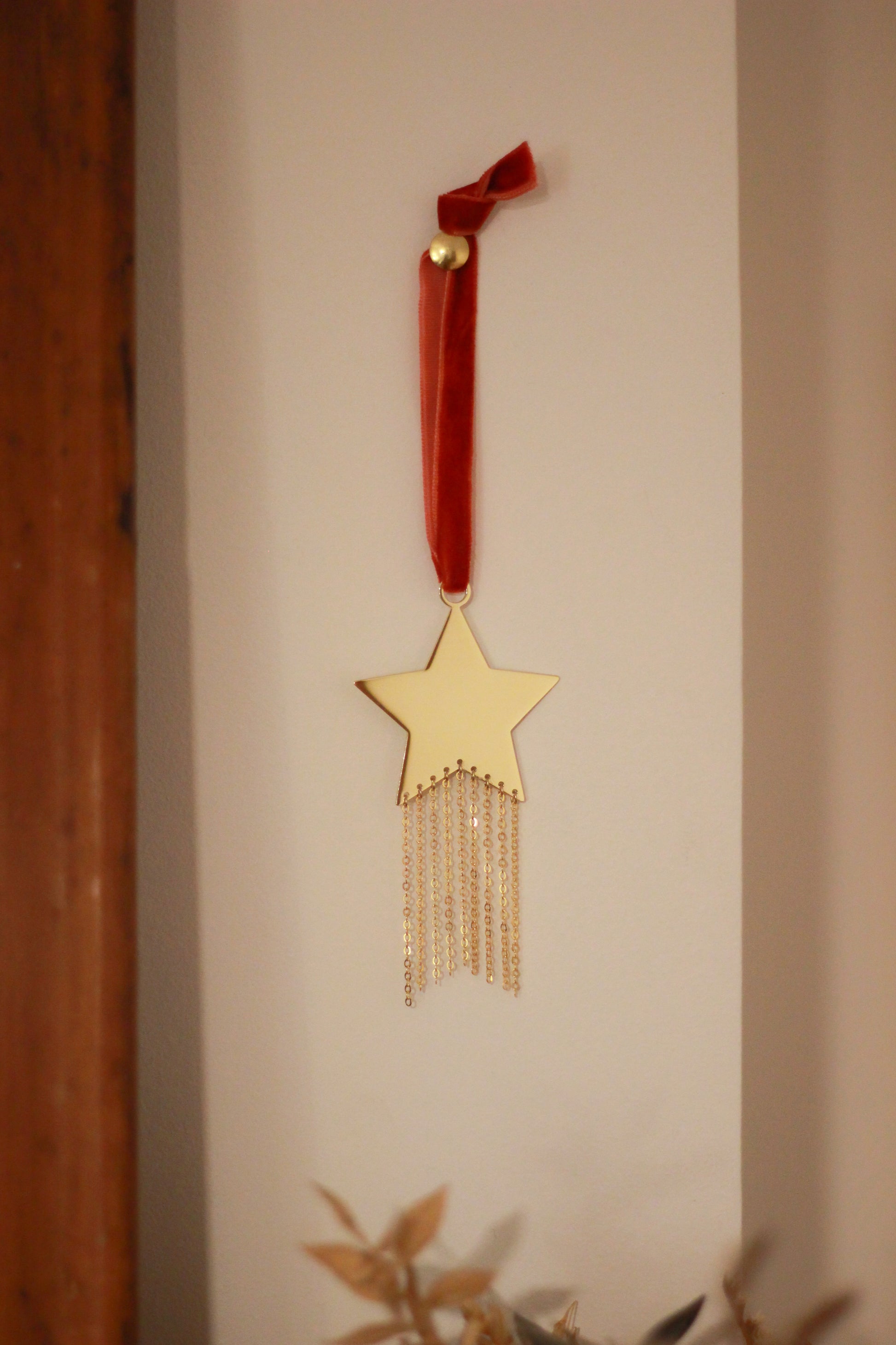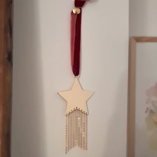 À suspendre dans votre maison avec son élégant ruban de velours, pour décorer un mur ou une poignée, cette petite étoile filante dorée apportera une touche de lumière et de douceur grâce à ses délicates chaînes scintillantes.